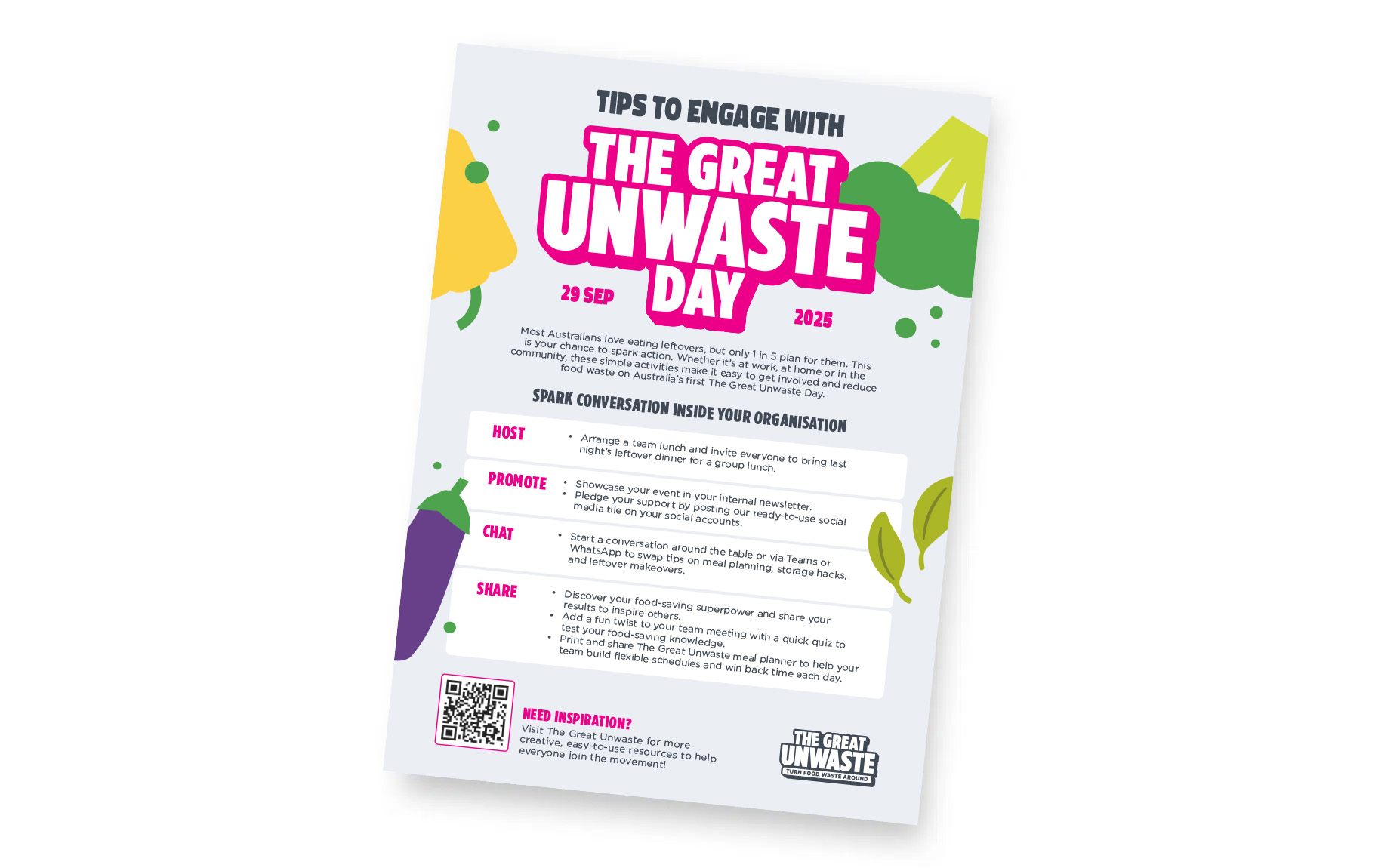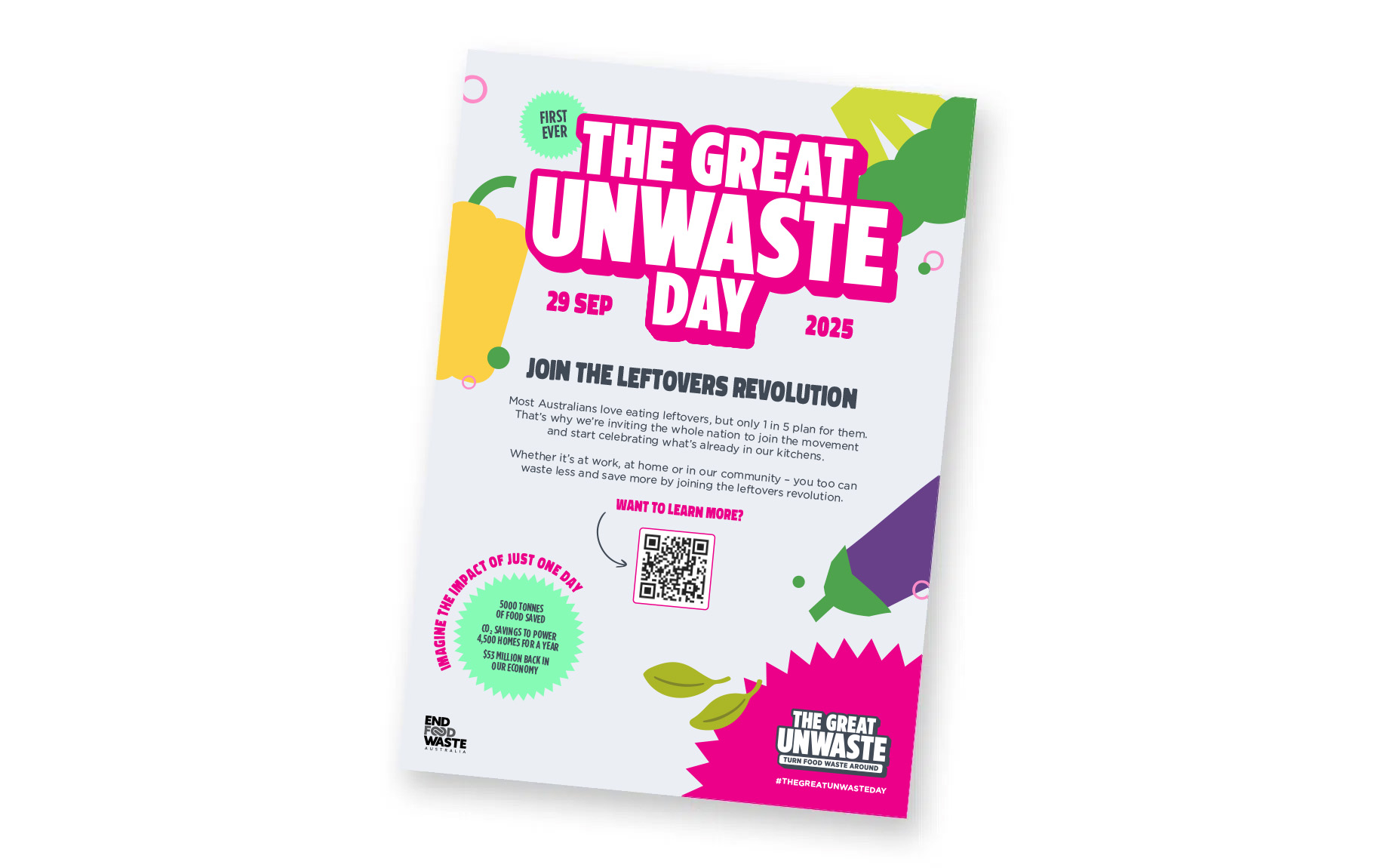 An eye-catching A4 poster perfect for hanging on office walls and lunchrooms. Use it to rally your colleagues, spark conversations and get your workplace behind The Great Unwaste Day.
